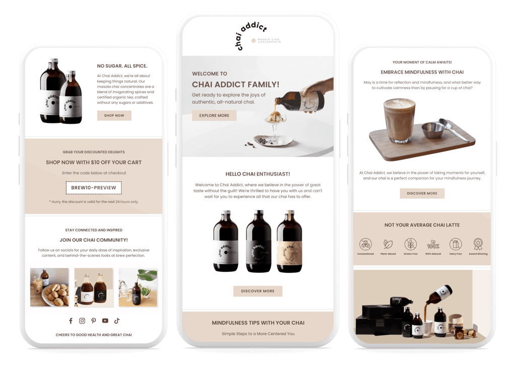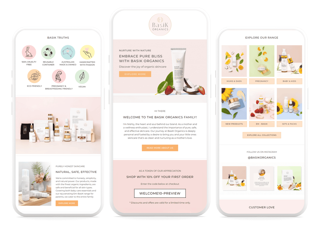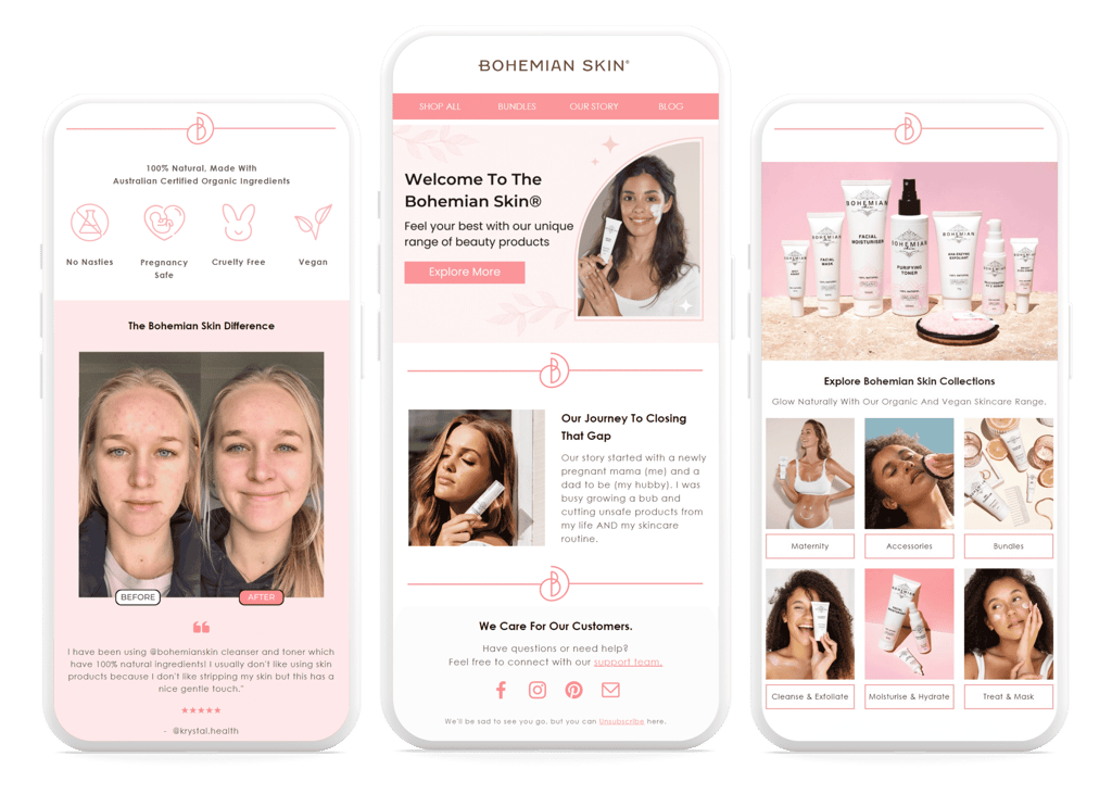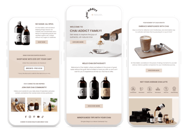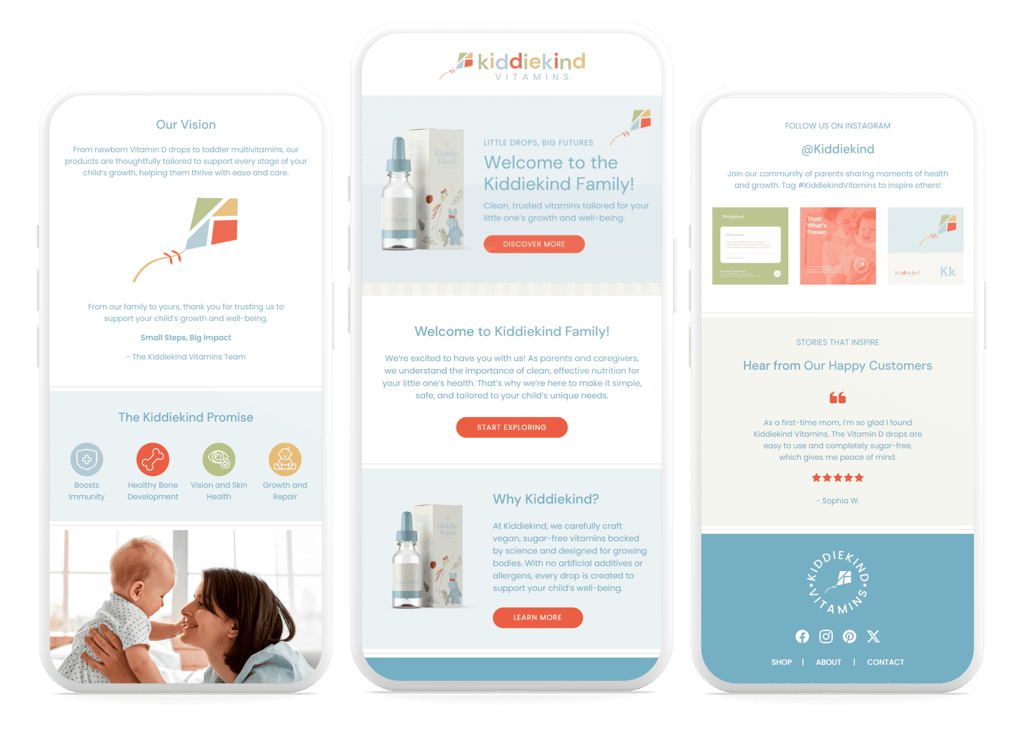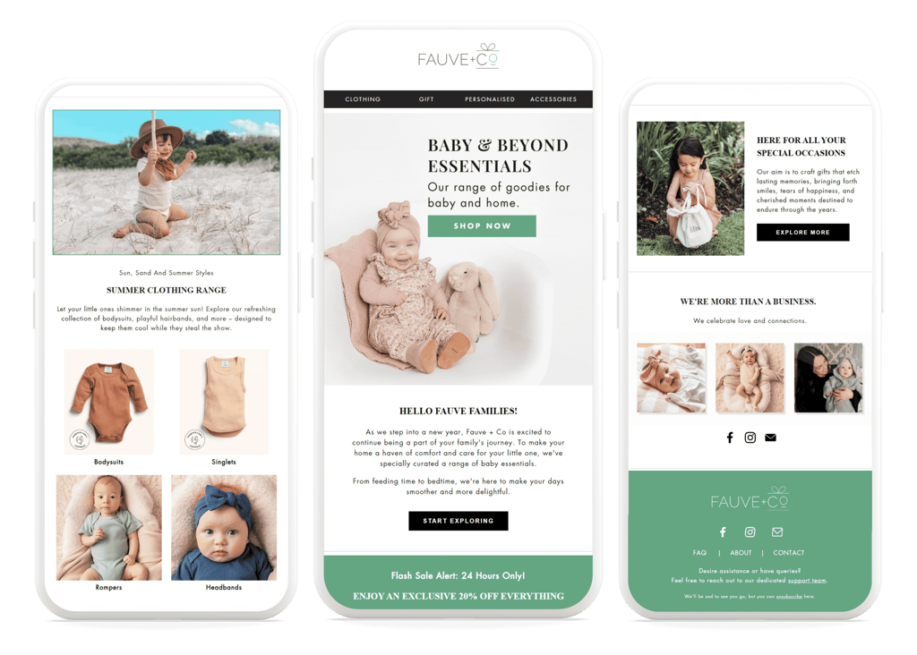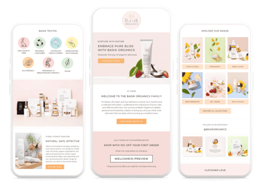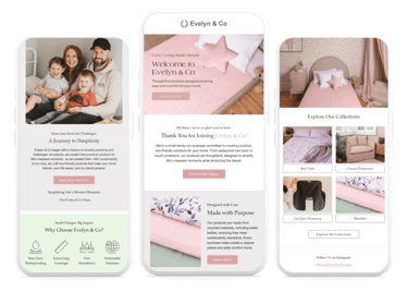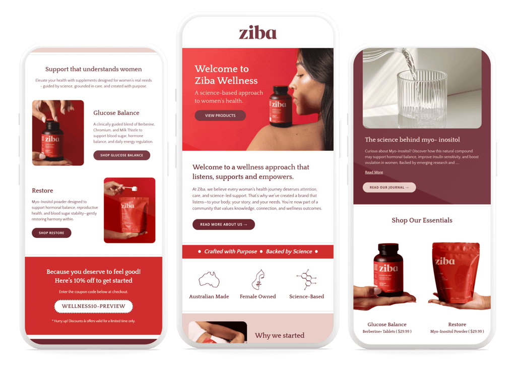 A selection of Klaviyo email templates designed for clarity, brand consistency, and retention. The previews below highlight how we structure emails for readability, hierarchy, and long-term use across email campaigns.